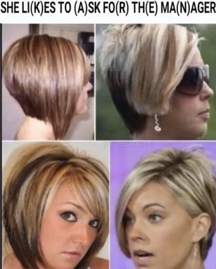 Web To get curls to look Karenified they curl thick sections of hair with a curling iron and then spray them to death with oil sheen and spritz so theyll be unmoveable. It is simply a short angled and layered hairstyle mostly worn by white ladies inverted bob or lob. Web 10 Shame-Worthy Karen Haircuts.